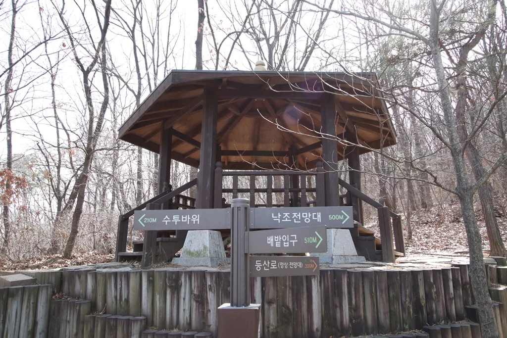 중반부는 숲길과 능선길이 반복되는 구간입니다. 고도 변화는 일부 있으나 급경사는 거의 없어 일정한 속도로 걷기 좋은 구간입니다. 낙조전망대에 도착하면 파주출판단지와 한강 인근 풍경을 조망할 수 있으며, 전망대 주변에는 잠시 쉬어갈 수 있는 공간도 마련되어 있습니다.